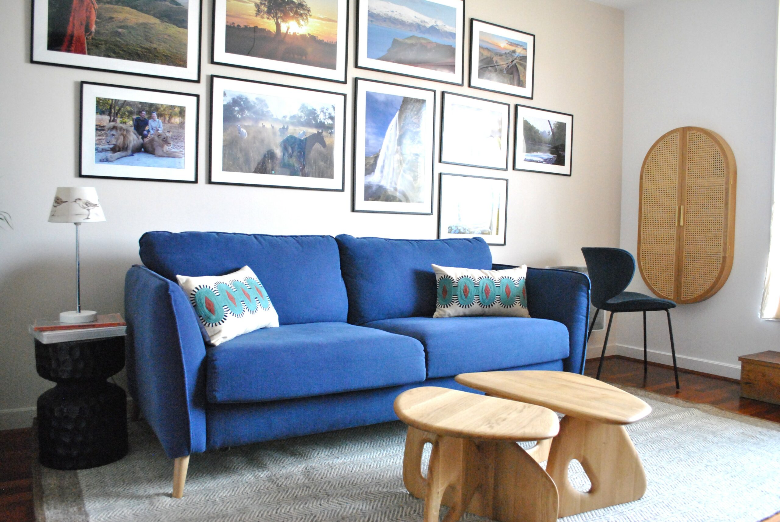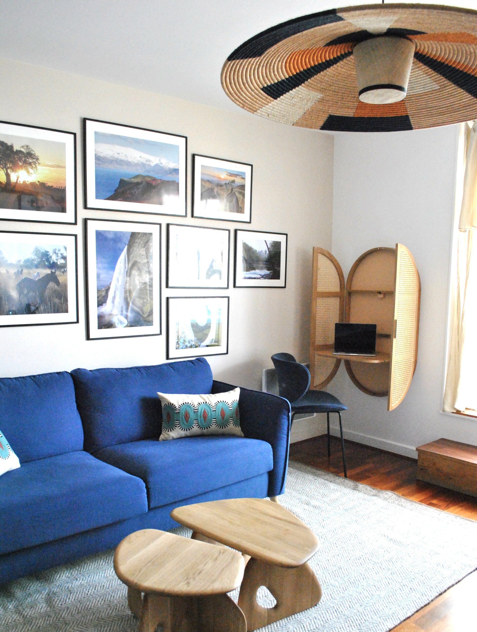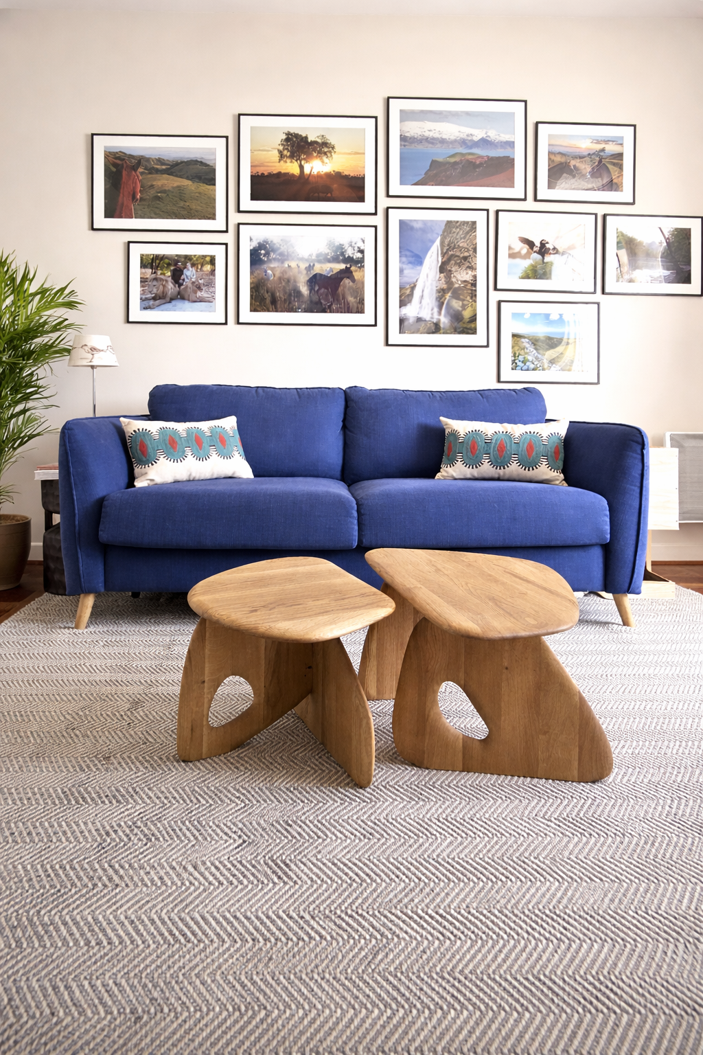 - Salon aménagé avec canapé bleu, tables basses en bois et mur de cadres.