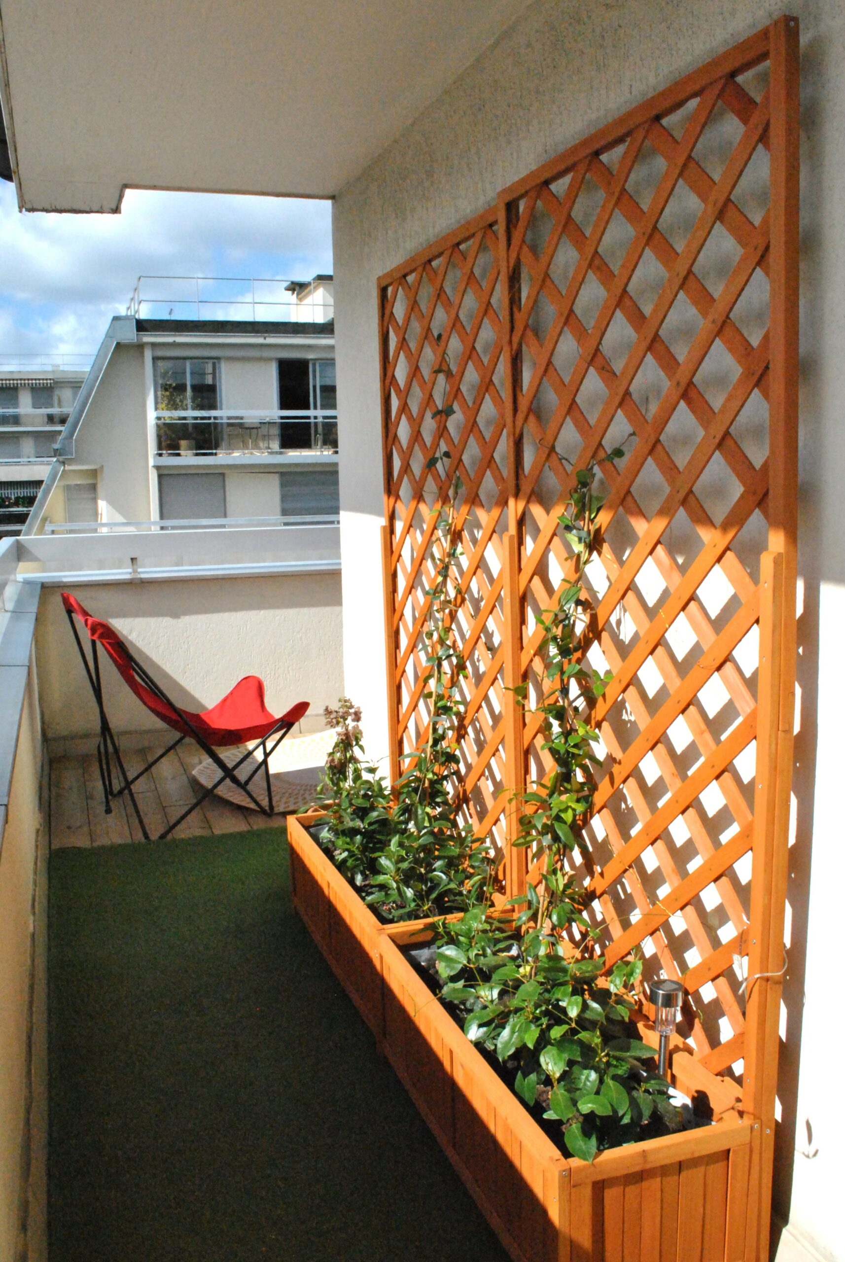 - Aménagement d’un balcon avec treillage en bois et plantes intégrées.