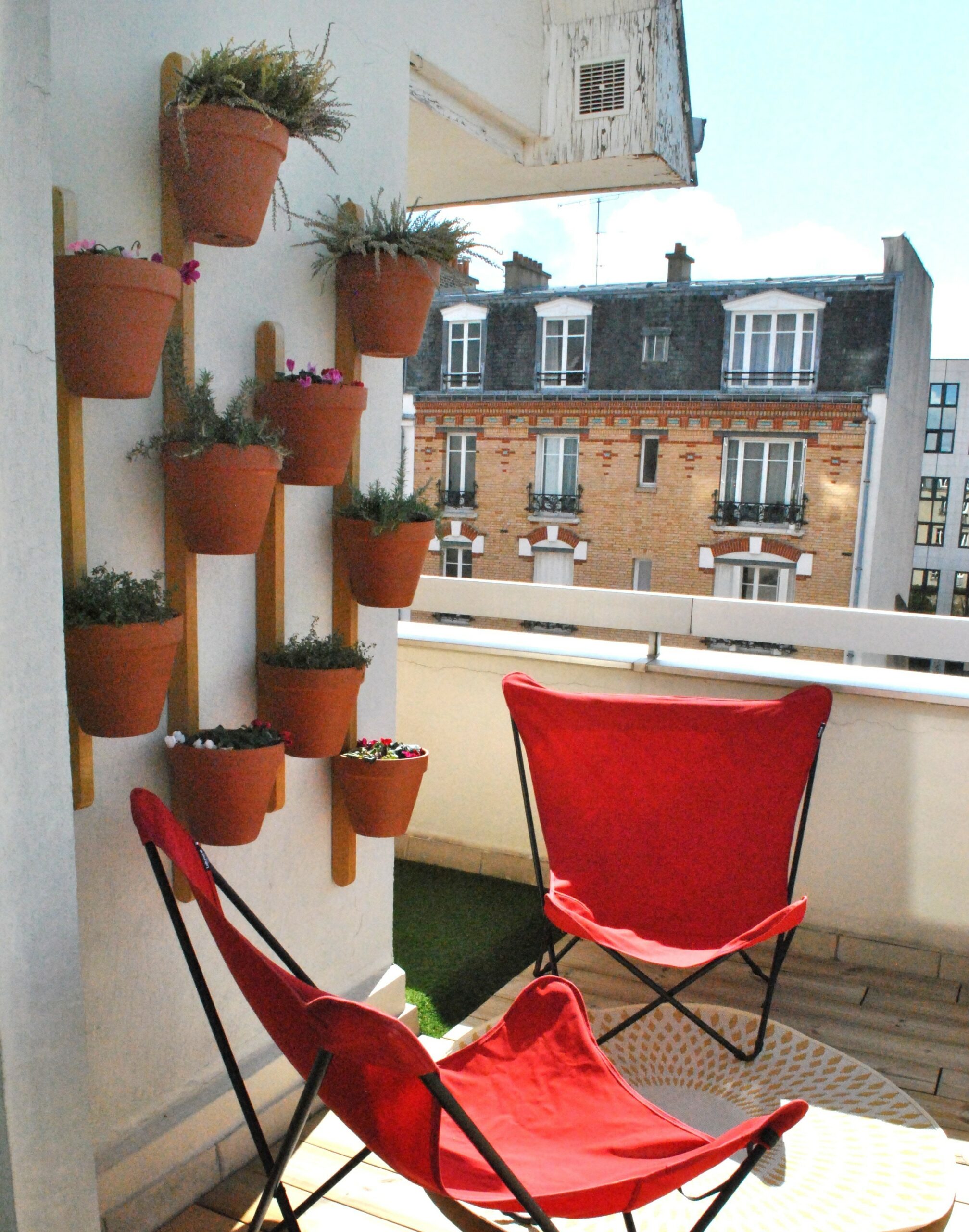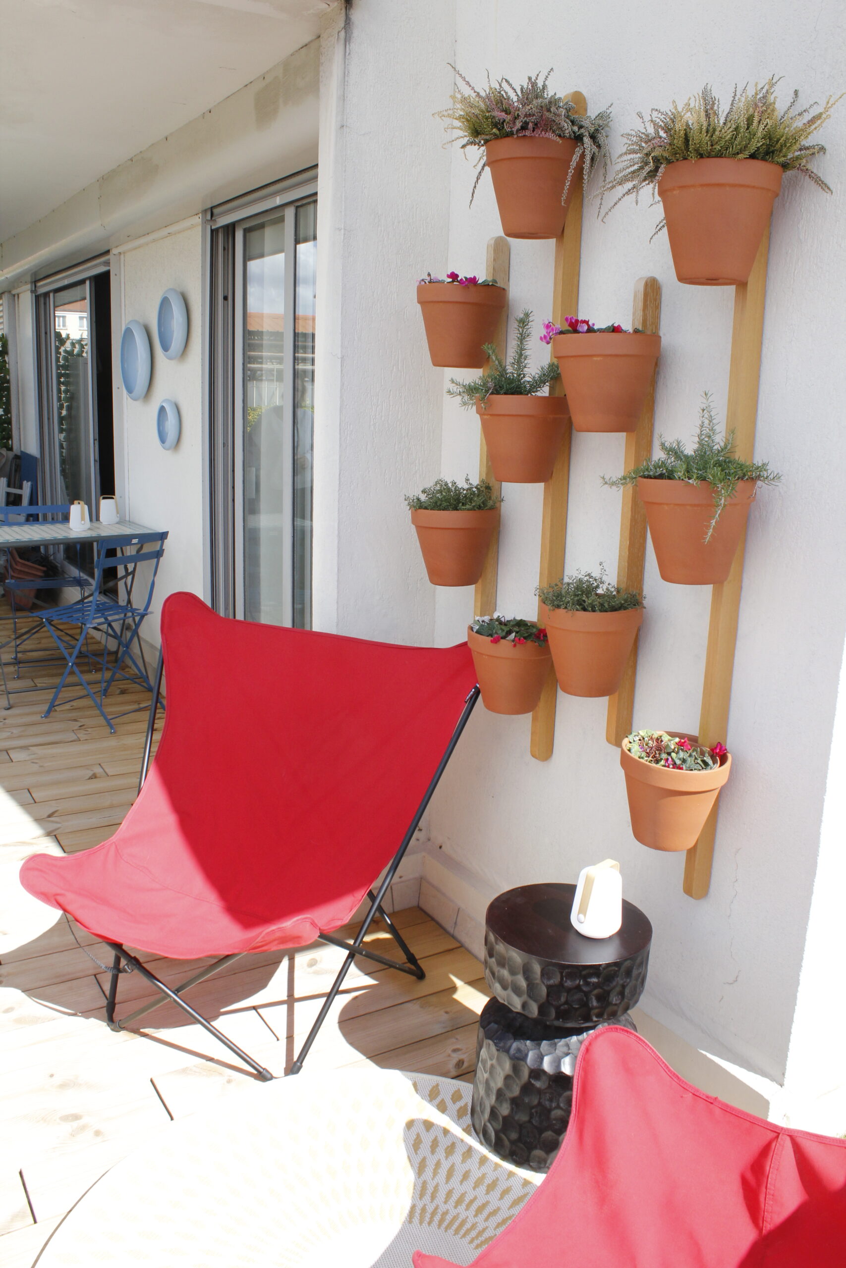 - Balcon aménagé avec assises rouges et mur de plantes en pots.