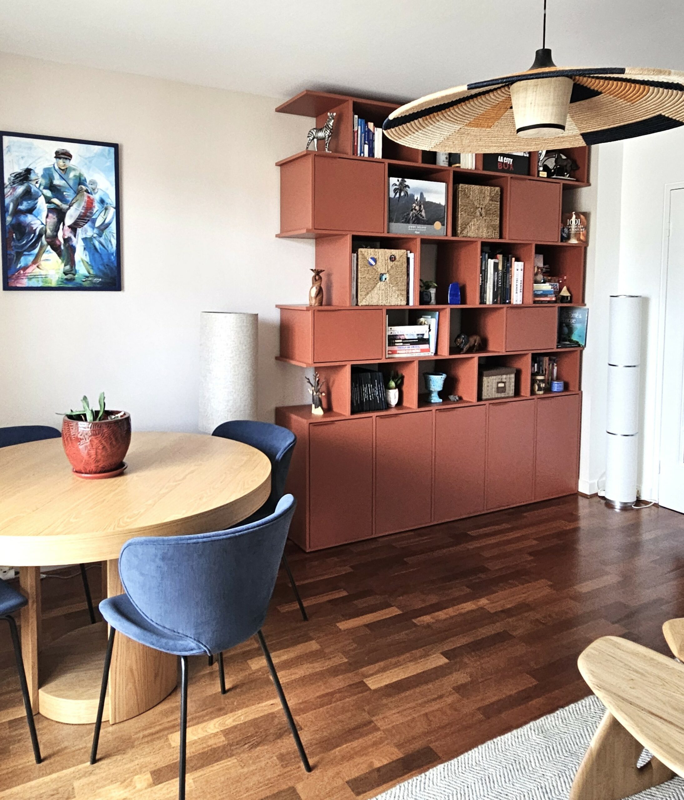 La bibliothèque sur mesure, réalisée dans une teinte terracotta profonde , structure le mur et apporte du caractère à l’ensemble de la pièce.