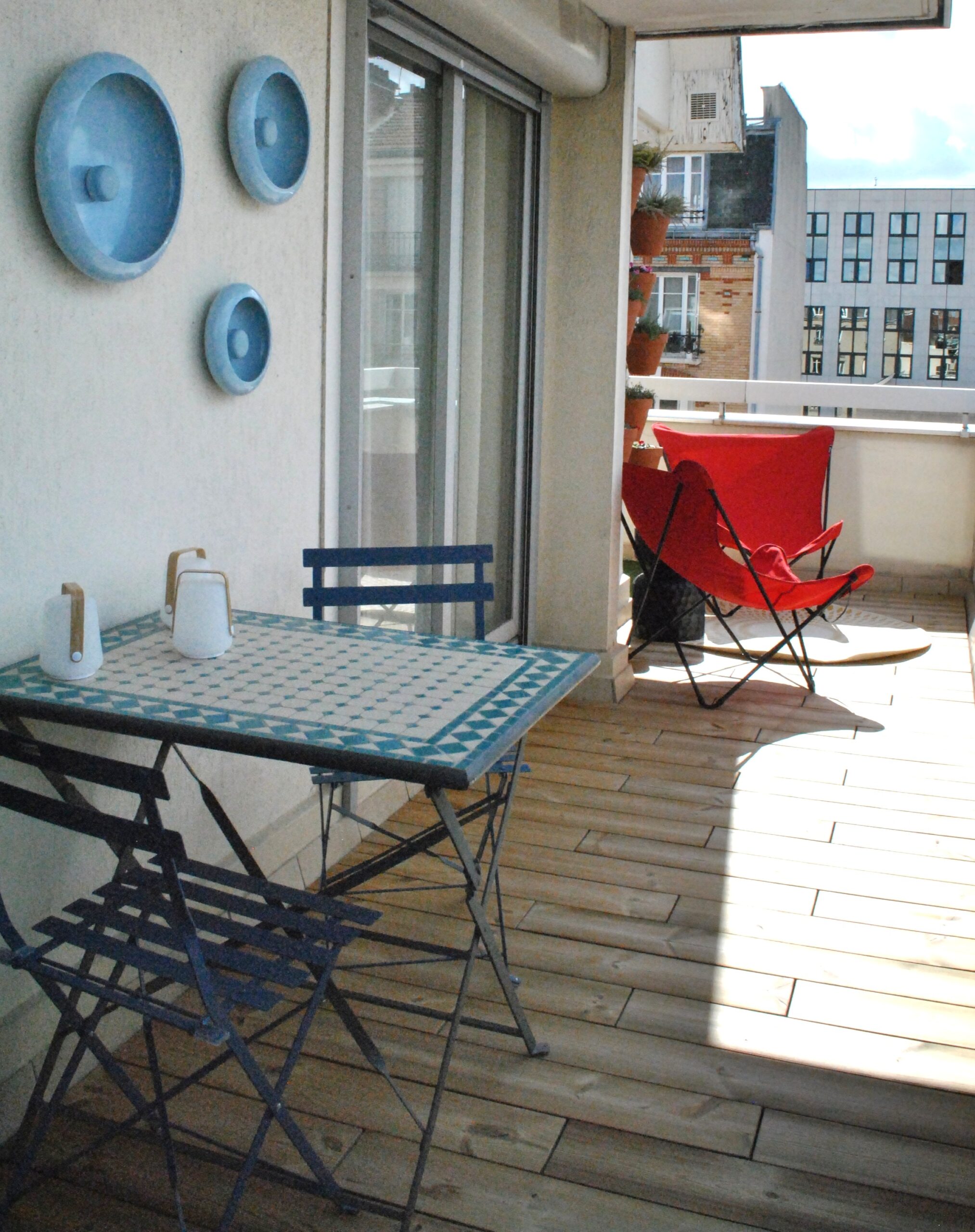 Pour le balcon, nous avons imaginé une véritable pièce en plein air . Un espace ouvert sur la ville, à la fois agréable et fonctionnel.