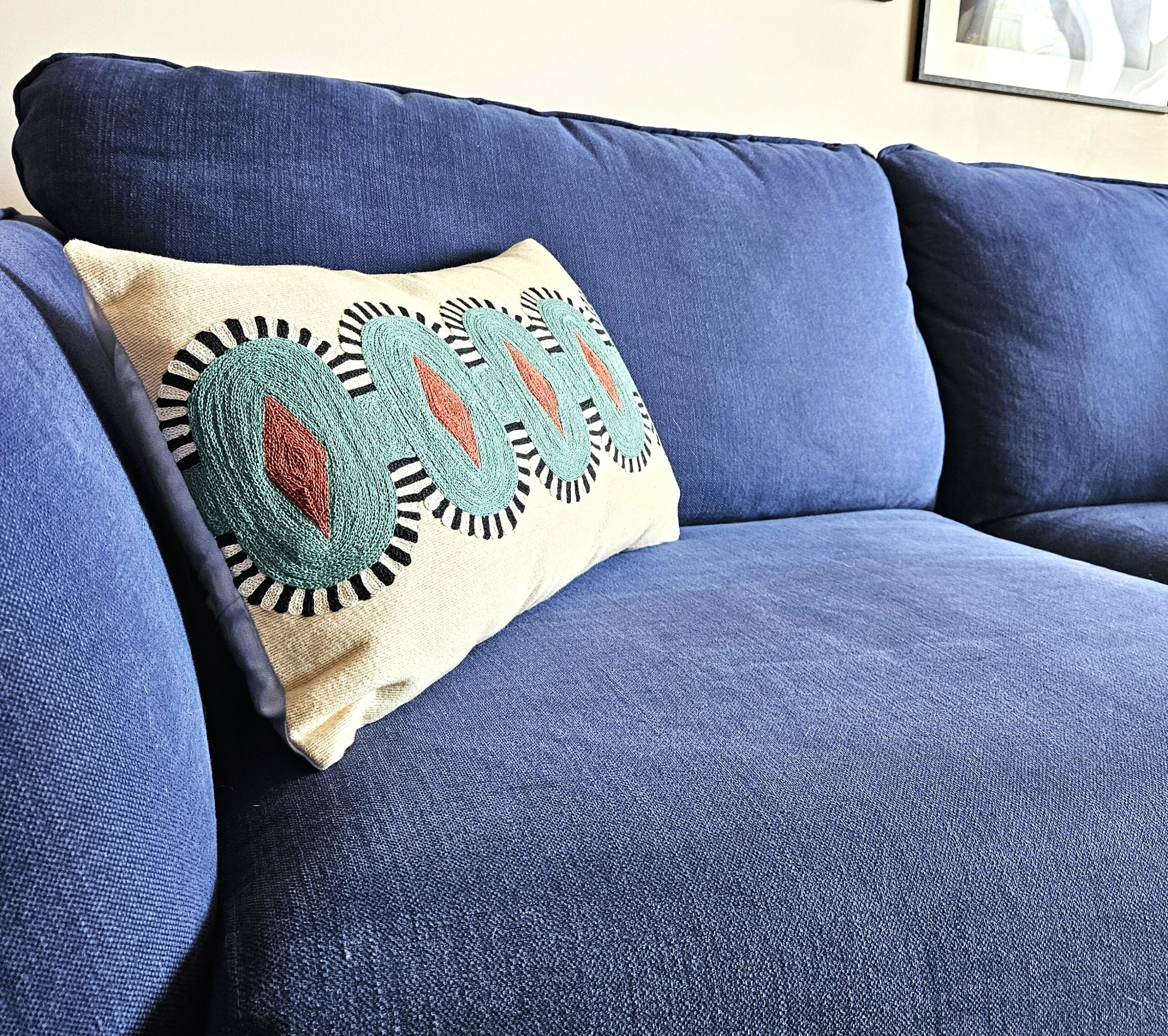 - Canapé bleu agrémenté d’un coussin décoratif.