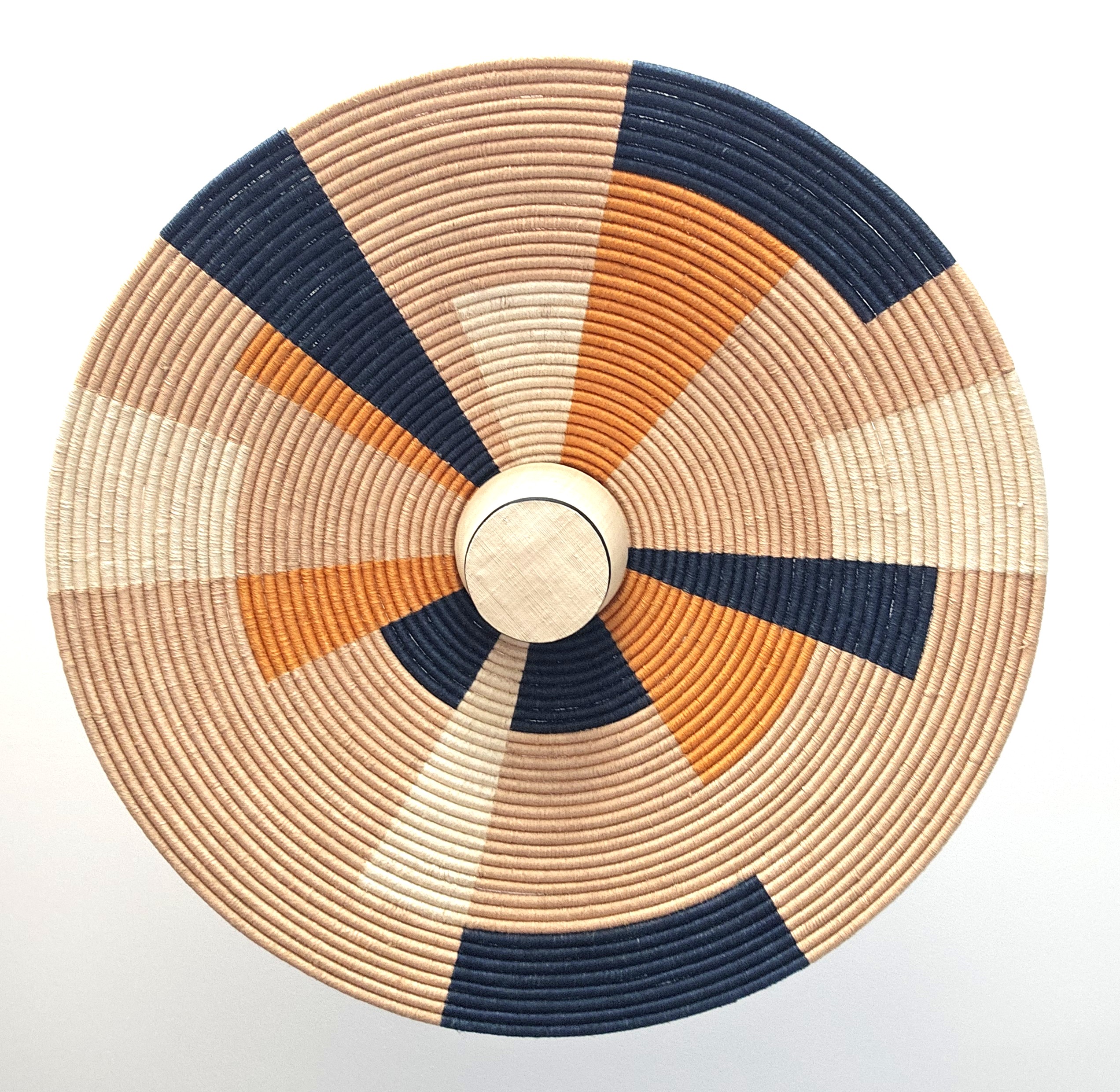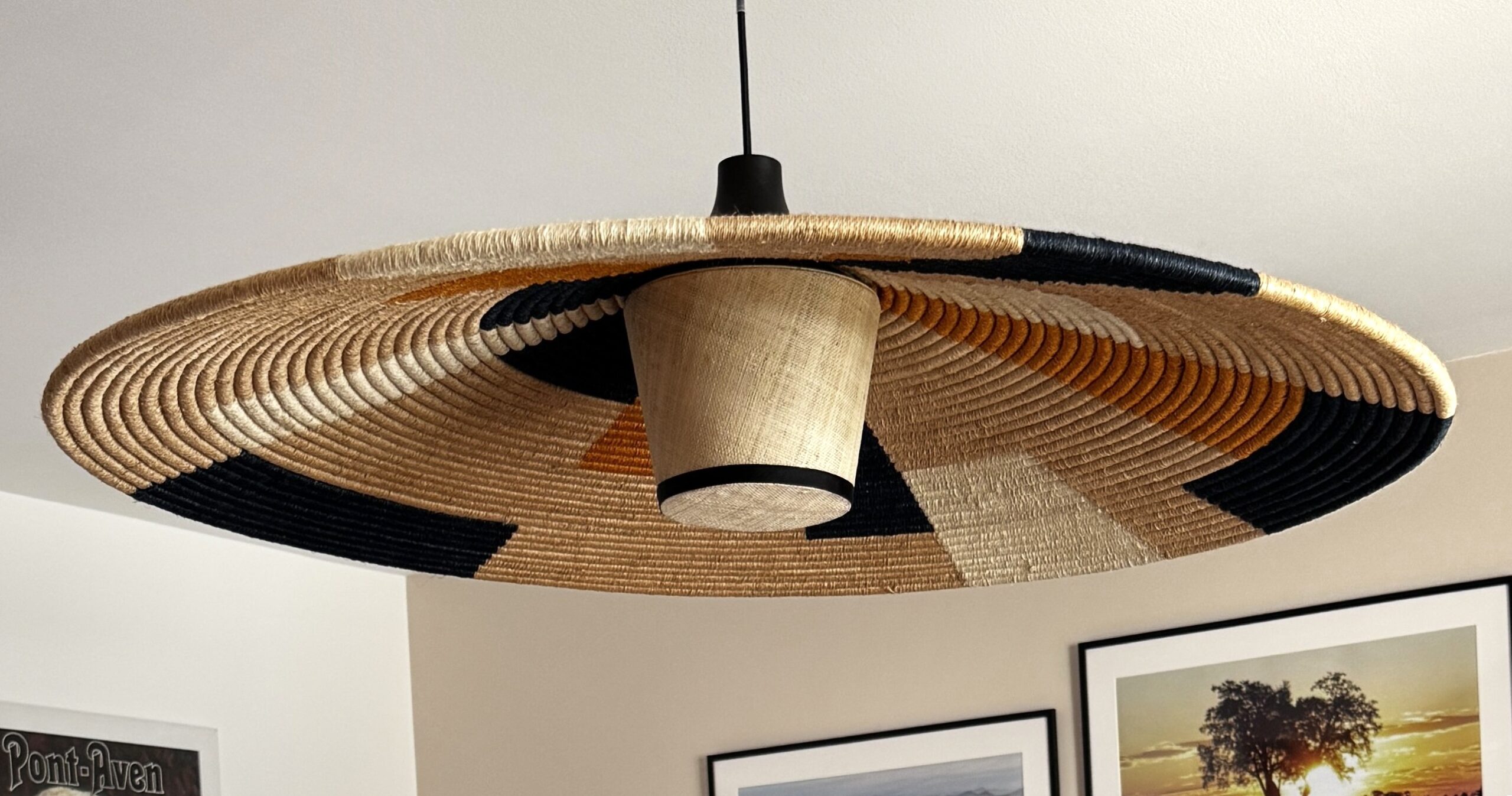 Dans ce salon, le luminaire de la maison Forestier en fibres tressées attire immédiatement le regard. Par sa taille, sa matière et ses couleurs, il apporte une présence sculpturale et artisanale .