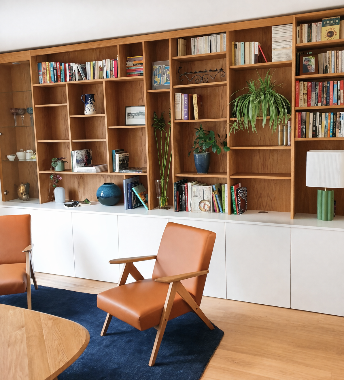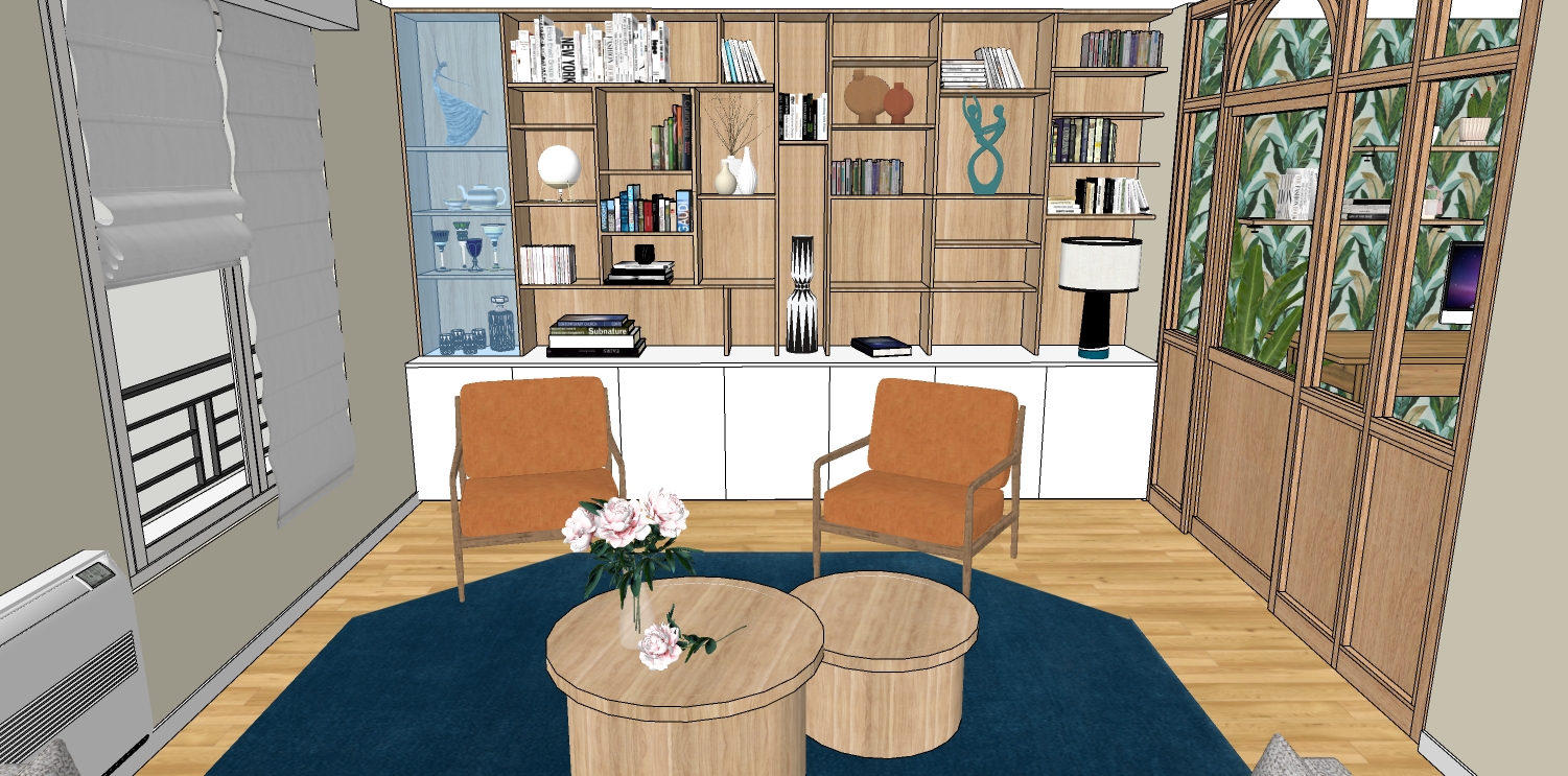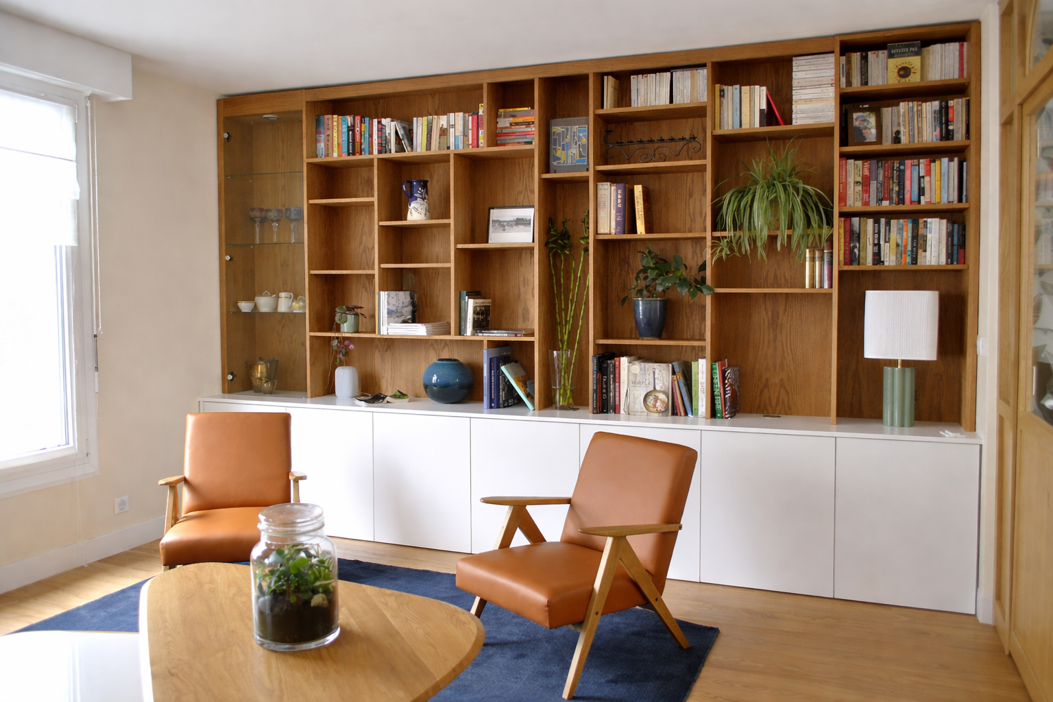 - Aménagement d’un salon avec bibliothèque sur mesure en chêne, pensé pour allier rangement et élégance.