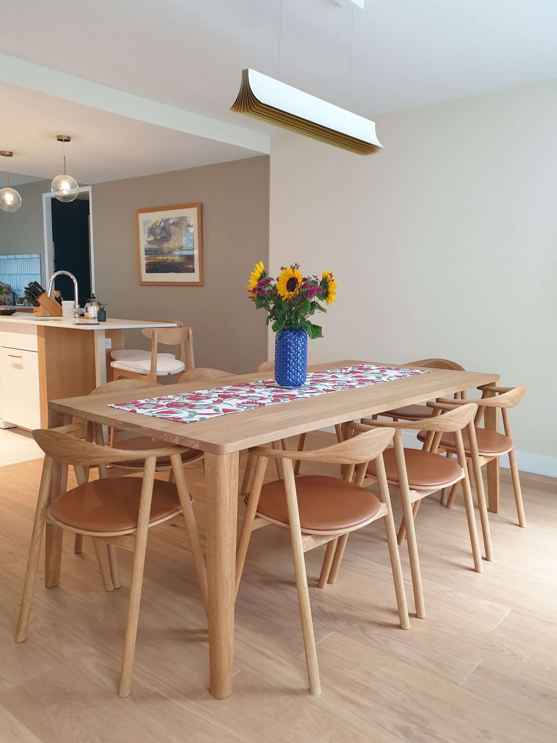 Dans la salle à manger, nous avons sélectionné des meubles en chêne clair. Une longue table structure l’espace, accompagnée de chaises aux formes organiques, subtilement rehaussées de cuir. Par ailleurs, les assises de l’îlot ont également été choisies en chêne clair , avec un tissu texturé qui apporte davantage de chaleur et de relief à l’ensemble.