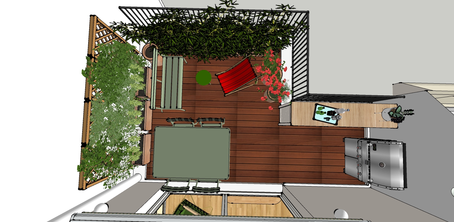 - Plan 3D du projet d’aménagement de la terrasse avec mobilier et plantations.