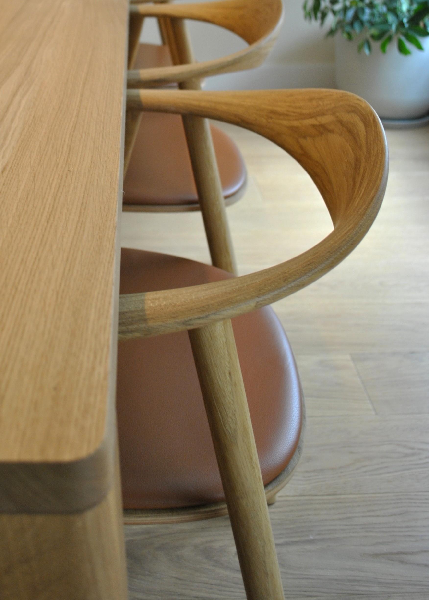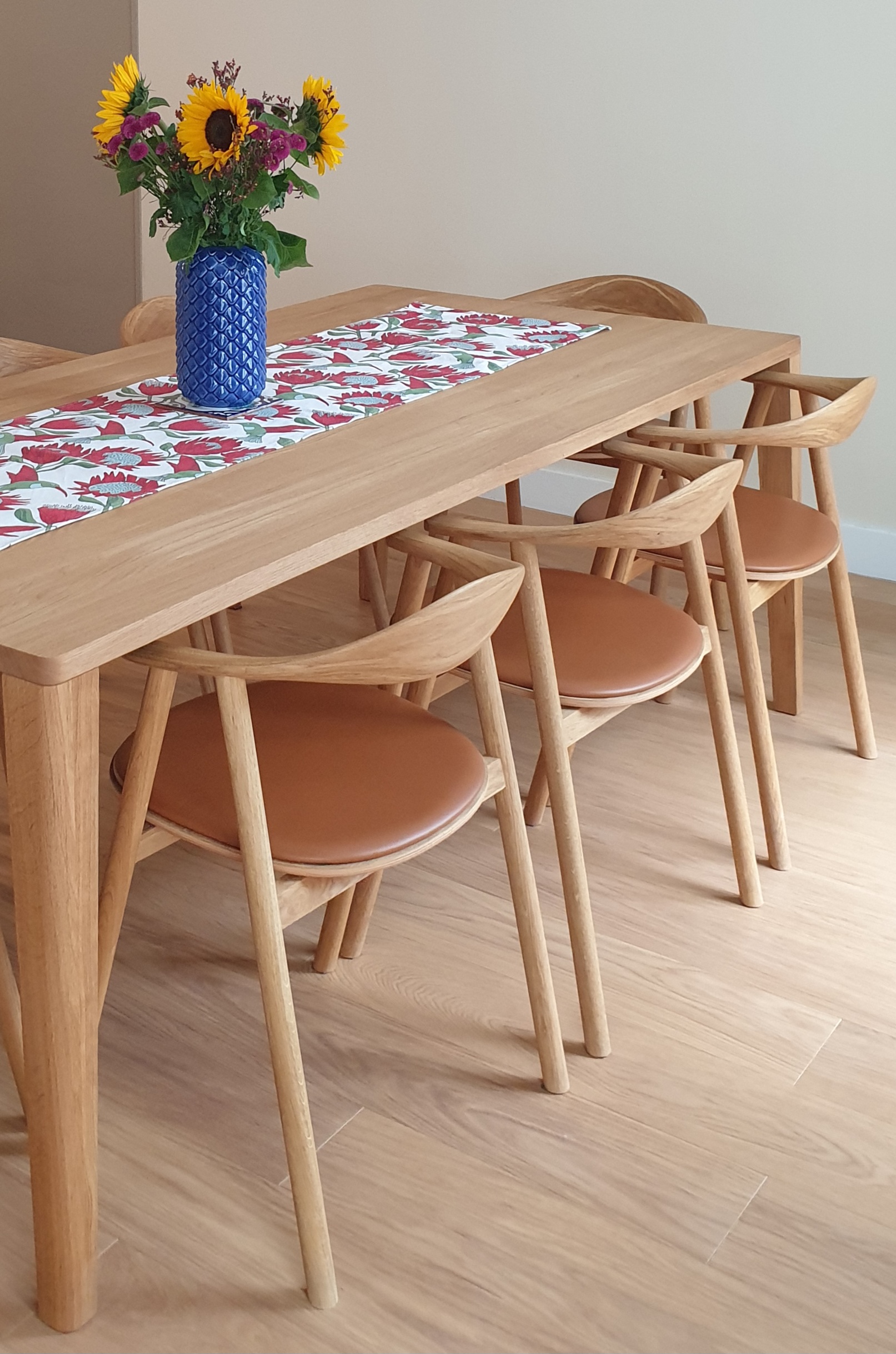 - Une table en bois clair entourée d’assises aux lignes douces.
