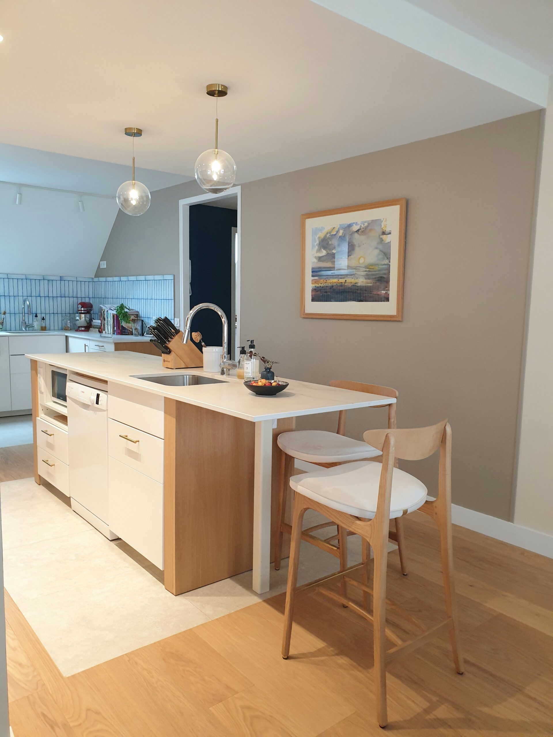 - Cuisine ouverte organisée autour d’un îlot central en bois clair.