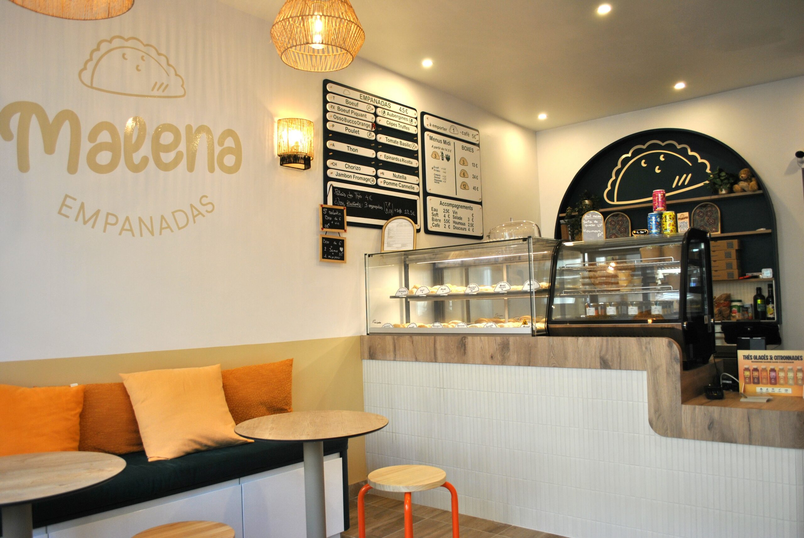 L’espace s’organise ainsi autour d’un comptoir central réalisé sur mesure , véritable cœur du restaurant. Conçu pour répondre aux normes PMR, il permet un accueil fluide et accessible à tous. Les empanadas, préparées sur place à partir de produits frais, y sont présentées et servies. Cette implantation favorise une circulation fluide entre la zone de préparation et l’espace clients. Elle offre également une lecture claire du lieu.