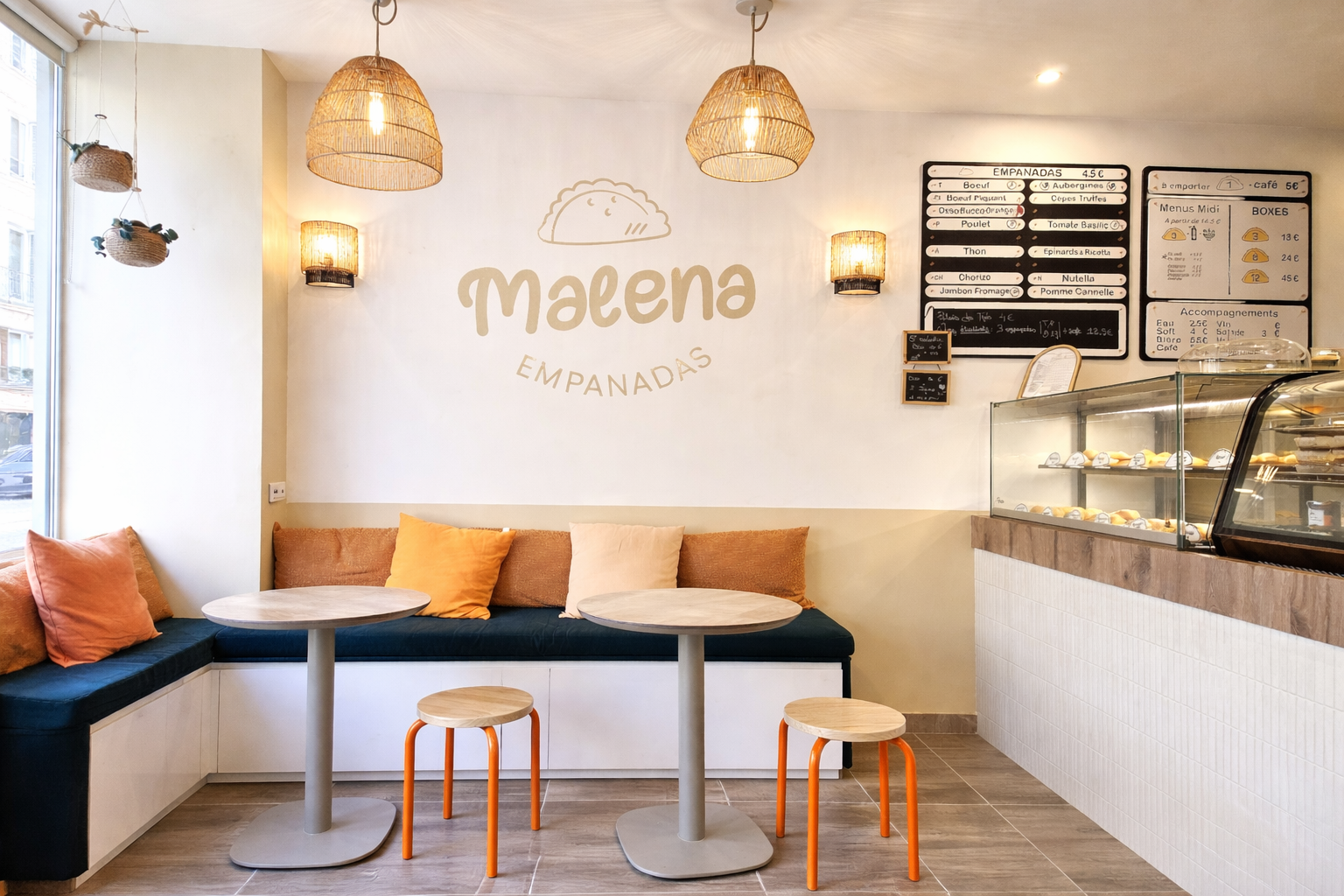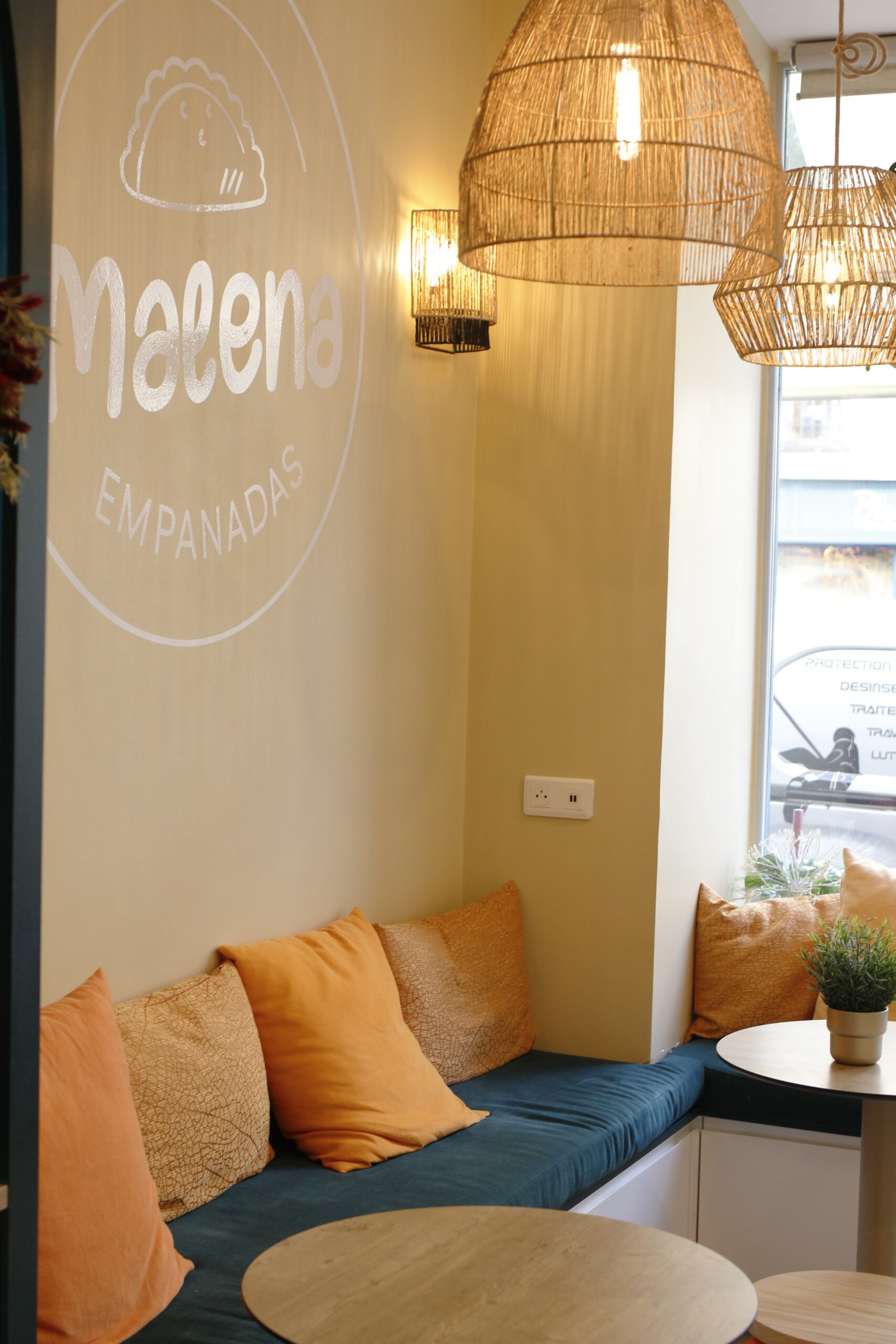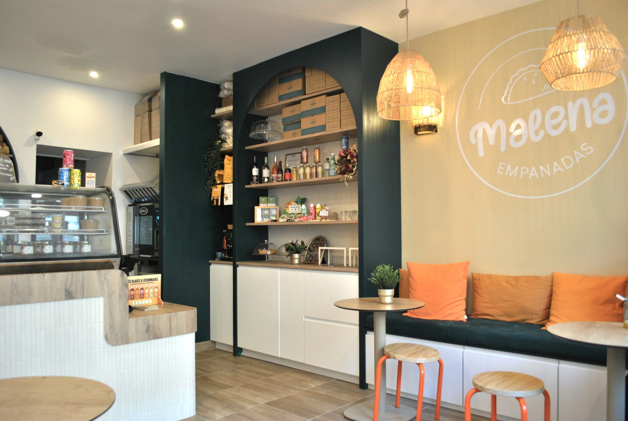 Enfin, la forme de l’alcôve, pensée comme un élément architectural fort, évoque subtilement la courbe de l’empanada et renforce l’identité du lieu. Le logo Malena, mis en valeur sur le mur, vient signer le projet et affirmer le caractère du restaurant. Les suspensions en fibres naturelles diffusent une lumière douce, participant pleinement à l’ambiance accueillante.