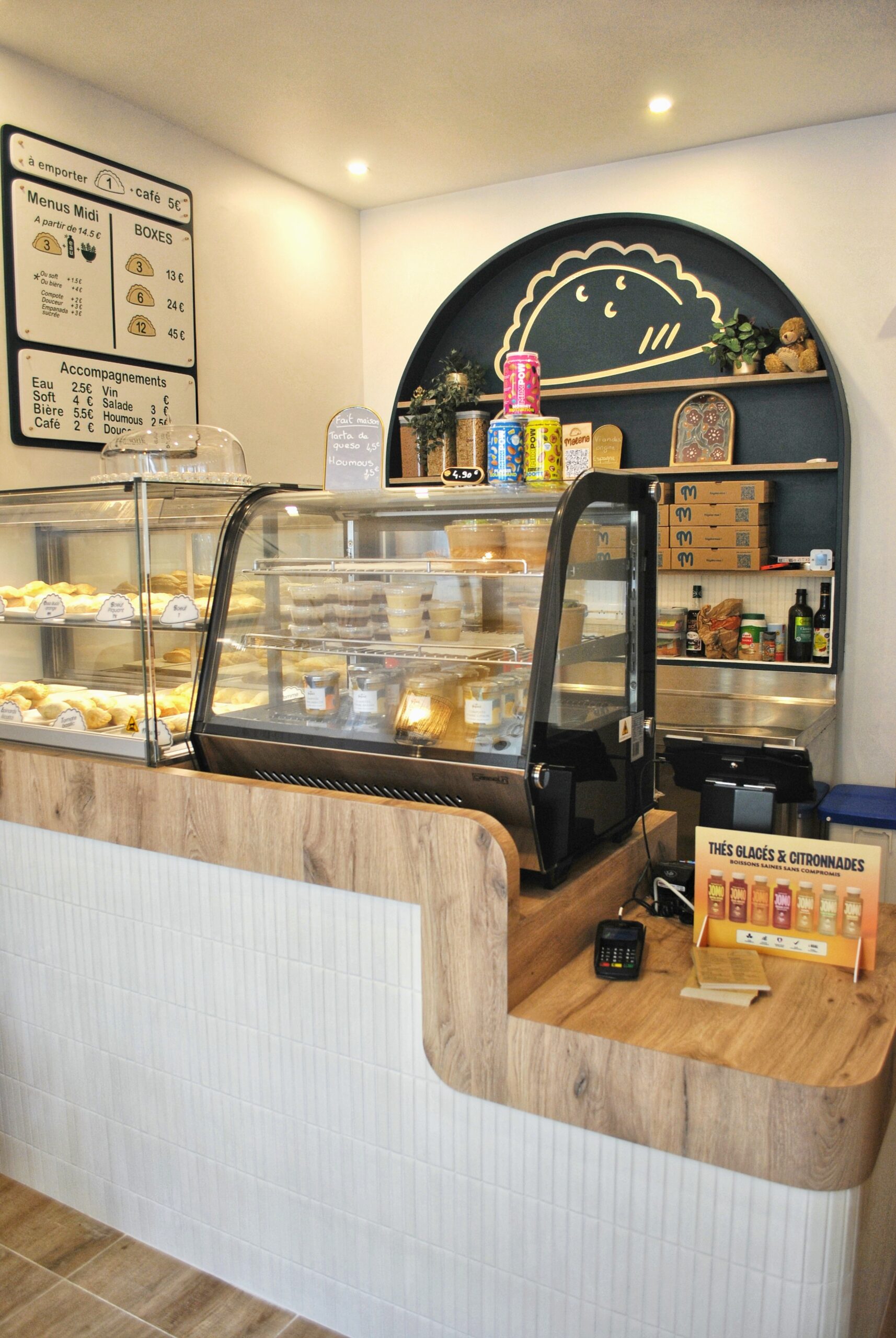 - Comptoir sur mesure avec vitrine et espace de vente dans un restaurant d’empanadas à Versailles